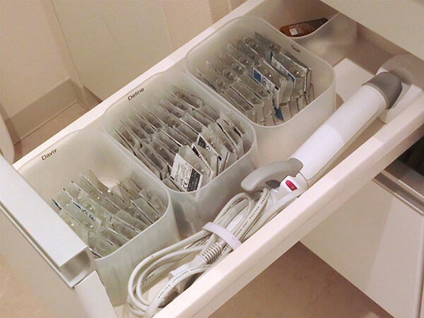 意外とお困りの声が多いのが、コンタクトレンズの収納。かさばる箱から出すだけで、だいぶコンパクトになります。また、在庫の数もひと目で分かるので、管理もしやすくなりますよ。引き出しを開けてワンアクションで取り出せる状態にすれば、準備の際の時間節約にもなります。