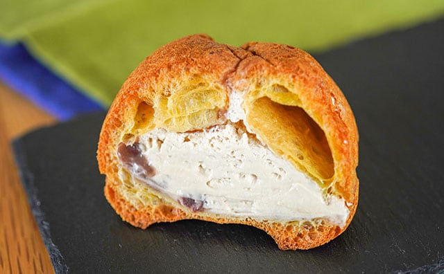 続いては2020年に発売され人気を博した「あんこと黒みつのシュークリーム」(税込178円)です。2021年7月27日(火)に再販され、SNS上には復活を喜ぶ声があがっている同スイーツは、榮太樓總本鋪が監修したもの。つぶあんカスタードと黒みつホイップ、2種のクリームがたっぷりとシュー生地の中に入っていますが、軽い食べ心地で美味です。