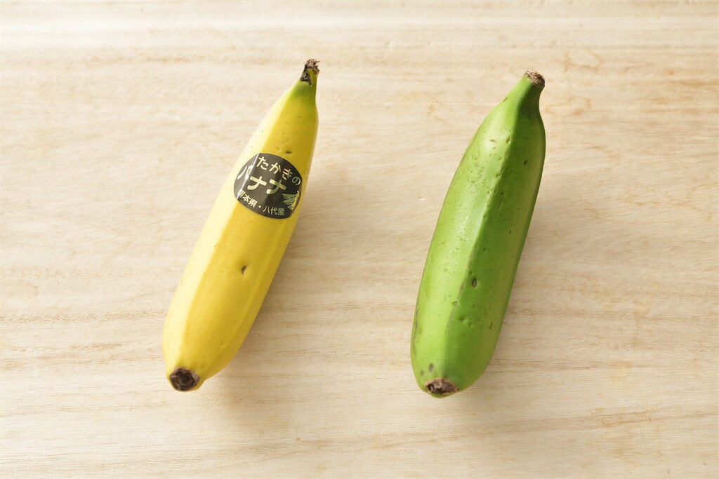 追熟したバナナ(左)と未熟な青バナナ(右)。