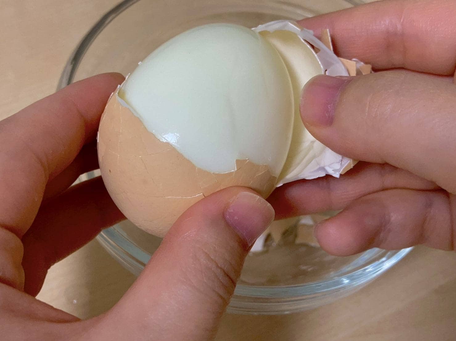 ヒビが入っている部分から剥いていくと……つるんと殻が剥けました!なにも入れずにゆでるより、断然剥きやすくなっています。