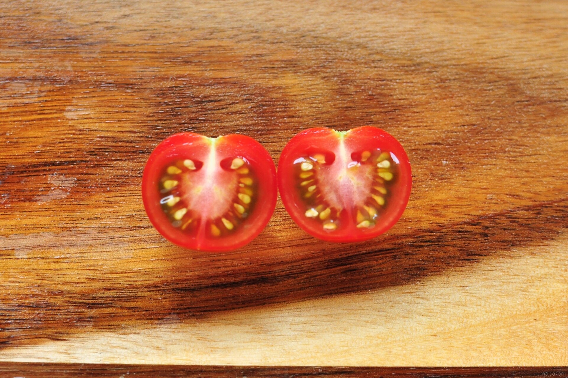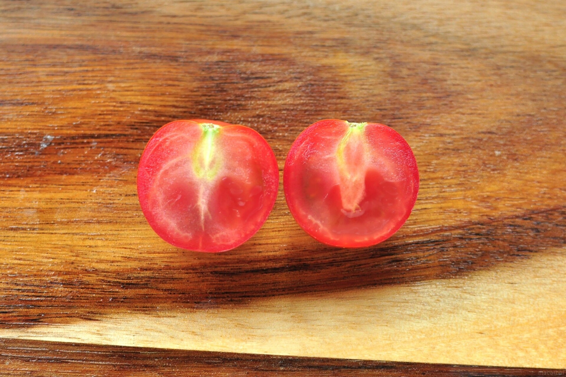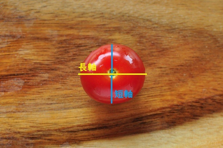 ミニトマトのヘタを取って真上から見てみると、まん丸ではなく少し楕円形をしているのがわかります。幅が狭いほうの「短軸」、広いほうの「長軸」でそれぞれ切ってみましょう。