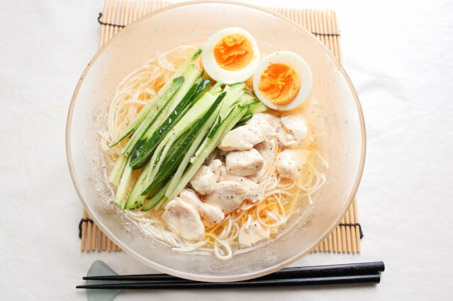 水をしっかりと絞って冷やしておいたスープに入れ、ささみ、きゅうり、半分に切った茹で卵を乗せ、黒こしょう、ゴマ油、お好みで塩を掛けたら完成です。
