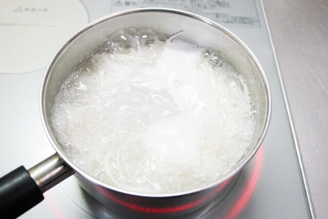 3.鍋にお湯を沸かし、沸騰したらそうめんとささみを入れて1分茹でます。