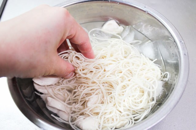 手が冷たくて無理!と思うまでそうめんをしっかりと冷やします。そうめんの温度でおいしさが左右されますよ。頑張って!