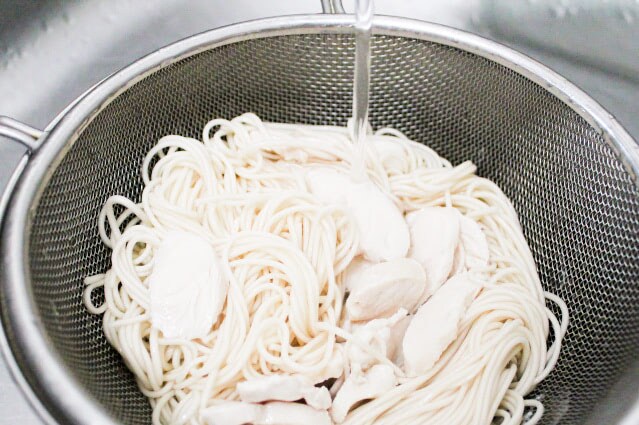 4.茹で上がったらそうめんとささみを流水で揉み洗いし、氷水でキンキンに冷やします。