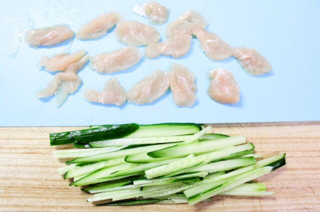 1.きゅうりを千切りに、ささみを薄く削ぎ切りにします。