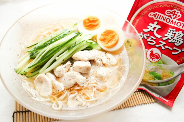 「無限鶏塩そうめん」のスープは冷たい水に調味料を溶かすので、溶けやすい鶏がらスープがおすすめとのこと。リュウジさんは味の素の丸鶏がらスープを使っていましたよ。