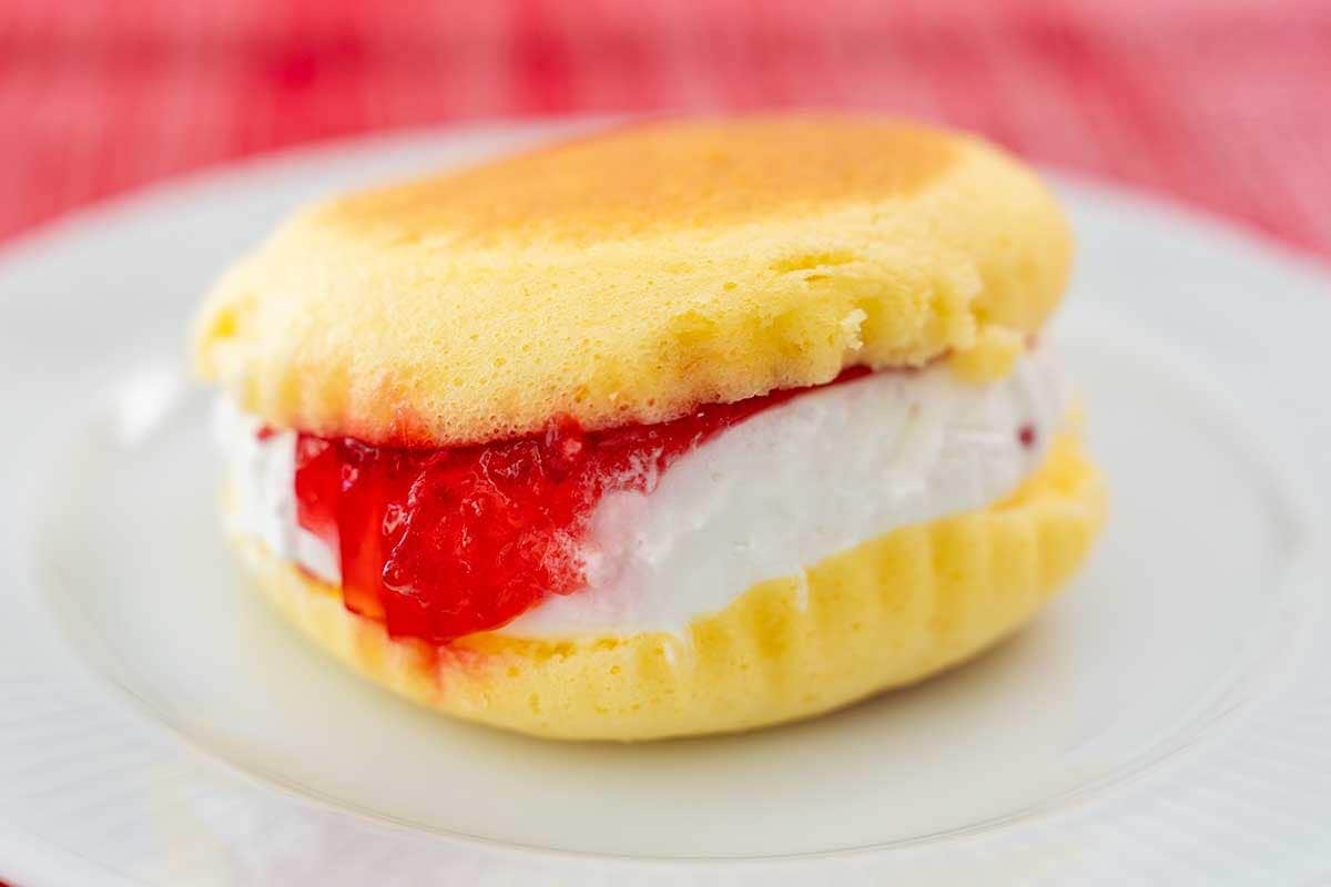 ふんわりとしたスフレ生地で、ホイップとカスタード、いちごジャム、いちご果汁入りのシュガーパウダーをサンドしたスイーツ。