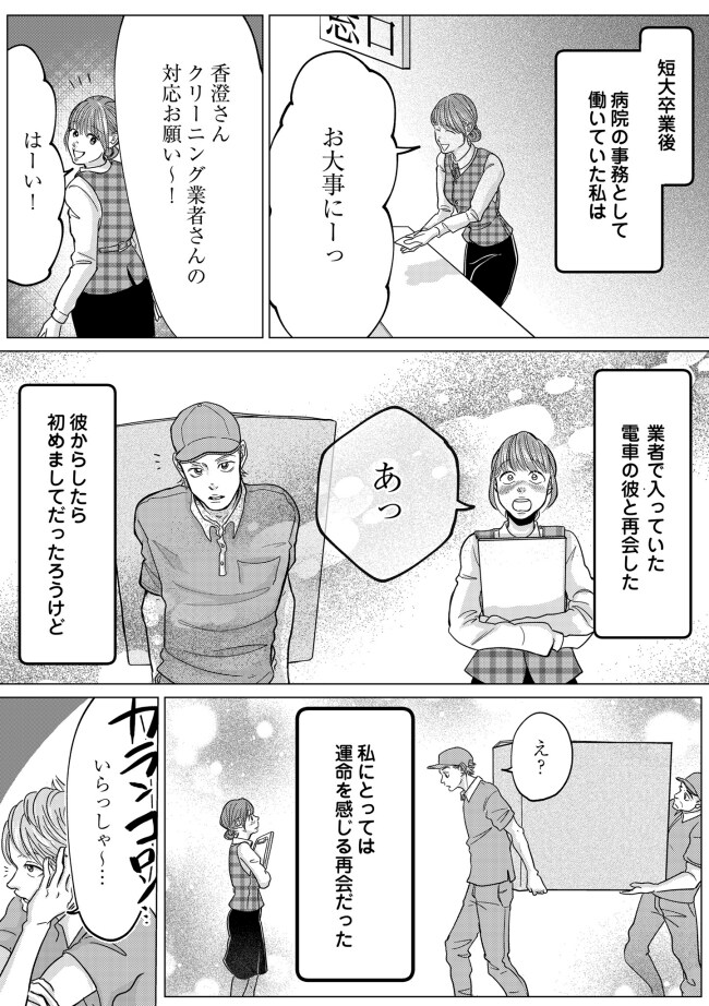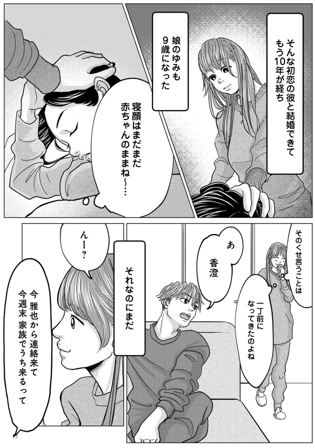 夫・洋介と娘の3人で暮らしている香澄。地味な高校生活を送っていた香澄は、通学中の電車内で見かけた洋介に惹かれていました。一生関わることはないと思っていたところ、なんと短大卒業後の職場で再会。そこから猛アタックをして、2人は結婚しました。