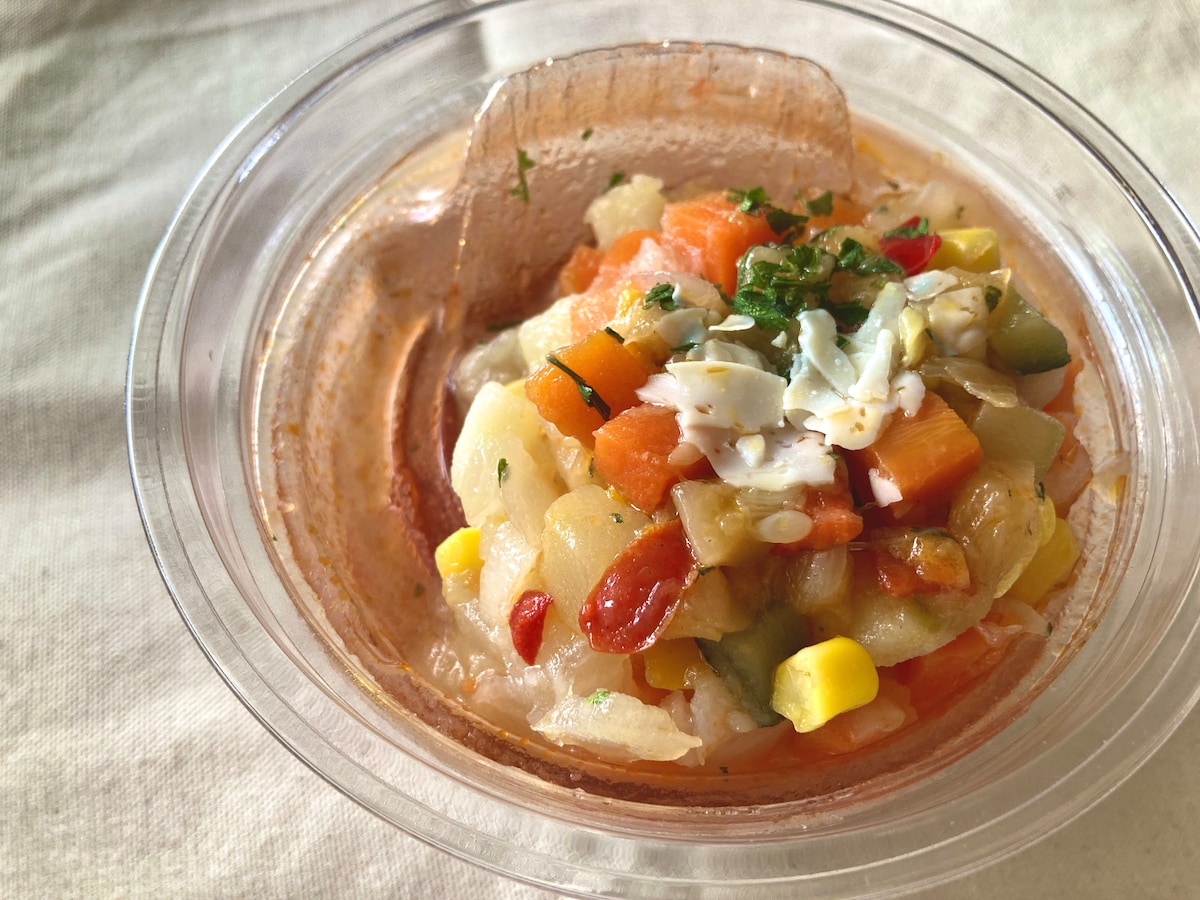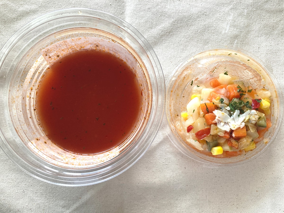 完熟トマトを使用した冷製スープで、人参・ズッキーニ・黄ピーマン・赤ピーマン・コーンなど彩りの良い野菜がトッピングされています。