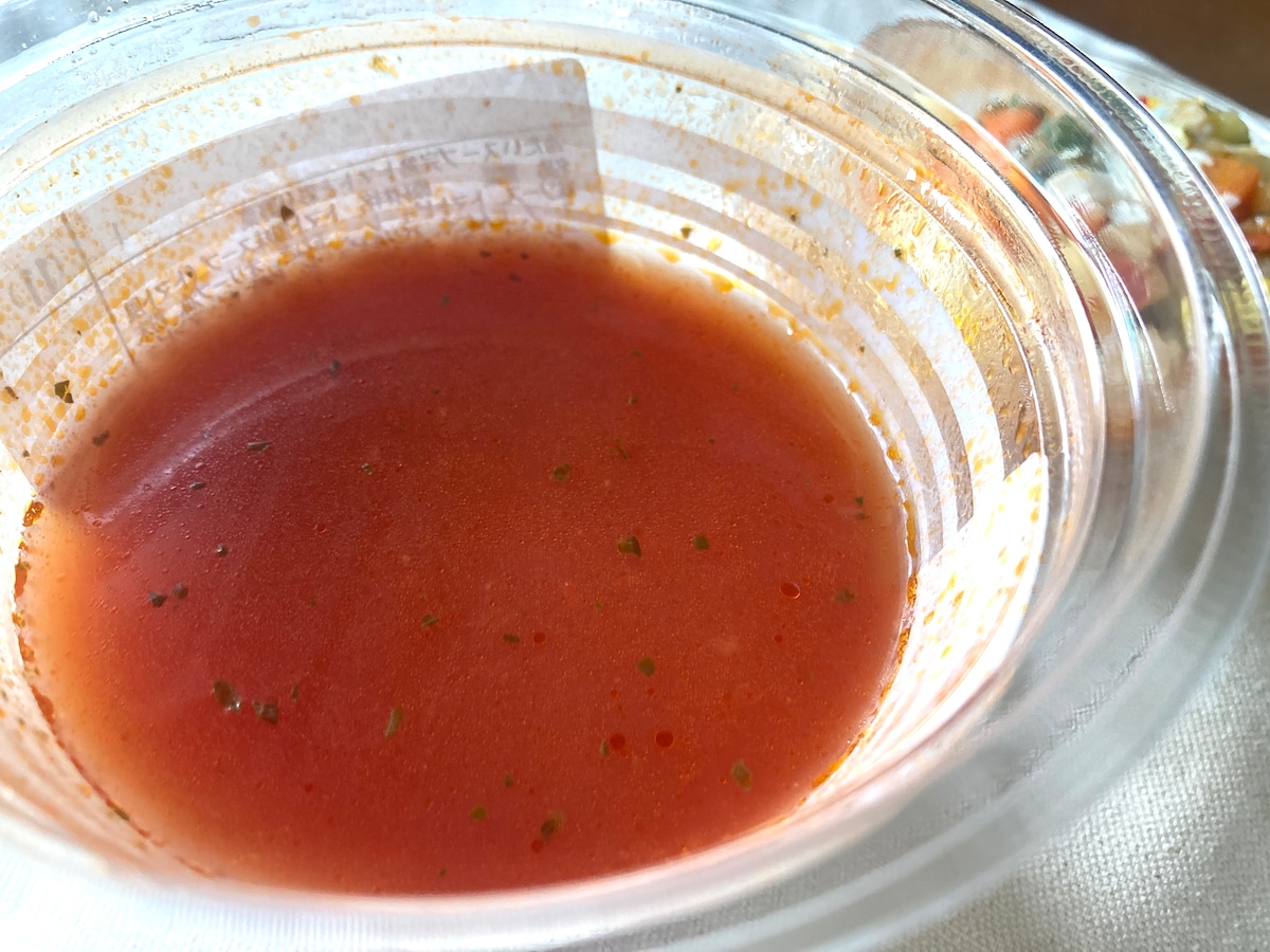 スープはトマトの酸味が程よく効いたサラサラ系。先ほどのバジルがかなりいい仕事をしています。正直、これがレストランで出てきてもわからないかも……というくらい味のクオリティーが高いです。