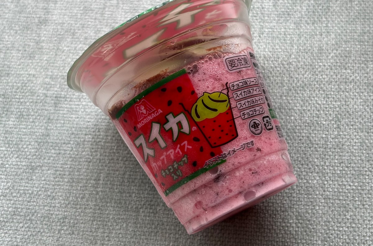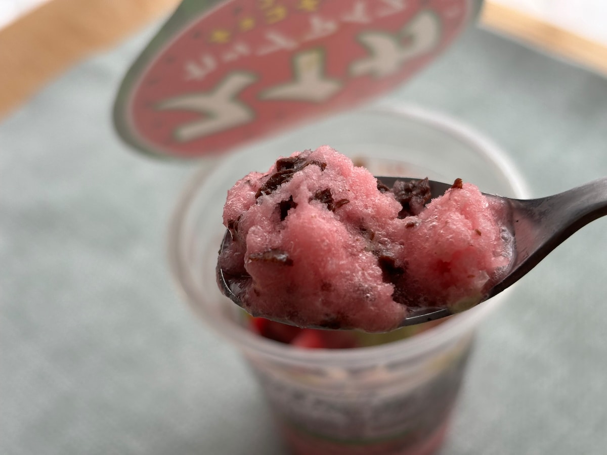 チョコチップ入りのスイカ味のみぞれの上に、チョコソースをかけたスイカ味のアイスクリームをトッピングしたカップアイス。