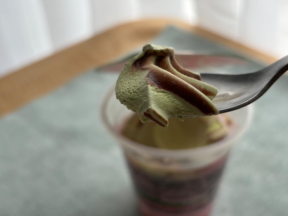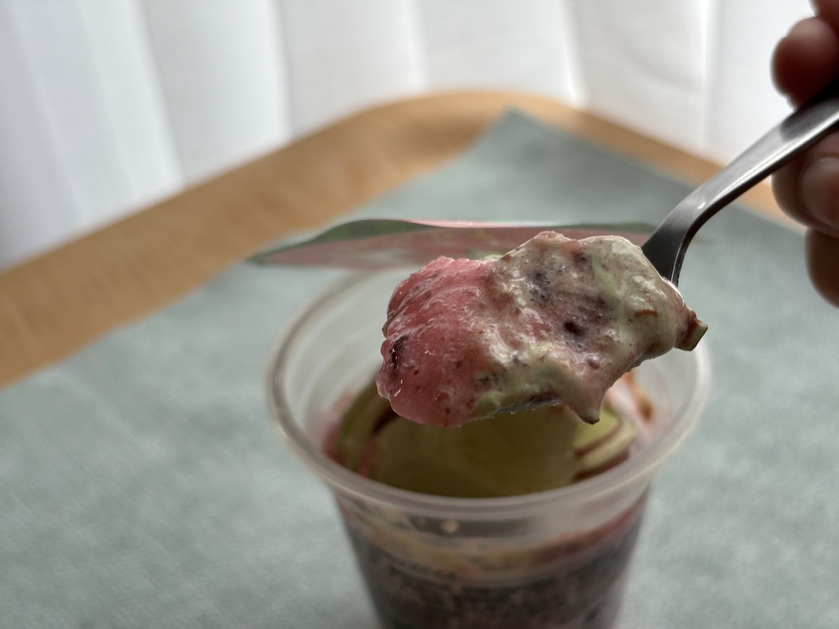 一番上のクリーム部分をすくって食べてみると、どこか懐かしい味わい!とってもおいしいスイカ味のアイスクリームでした。口当たりが滑らかで、食べやすいのも魅力的です。