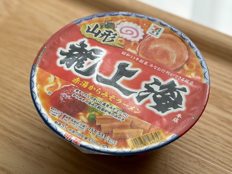 山形県内を中心に複数の店舗を構える「赤湯ラーメン 龍上海(りゅうしゃんはい)本店」監修のカップ麺。味噌と鶏ガラに煮干しだしを合わせた濃厚スープに、唐辛子とニンニクを合わせた辛味噌と麺を絡めて食べる1杯です。