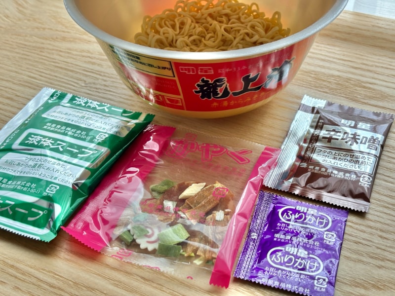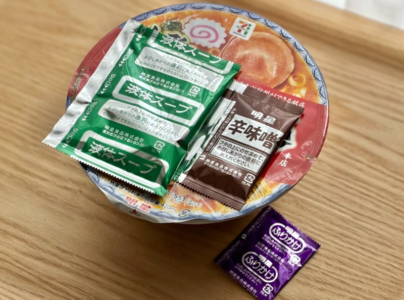 ふたを開けると、中には「液体スープ」「かやく」「辛味噌」「ふりかけ」の4つのパックが入っていました。