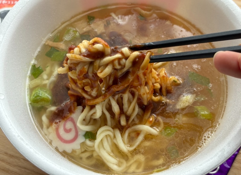 続いて、辛味噌をしっかりと混ぜて麺をすすってみると……刺激的な味がプラスされ、違った味わいに!とはいえ、辛すぎることもなく、これまでに食べたことのない、どこかクセになる味です。
