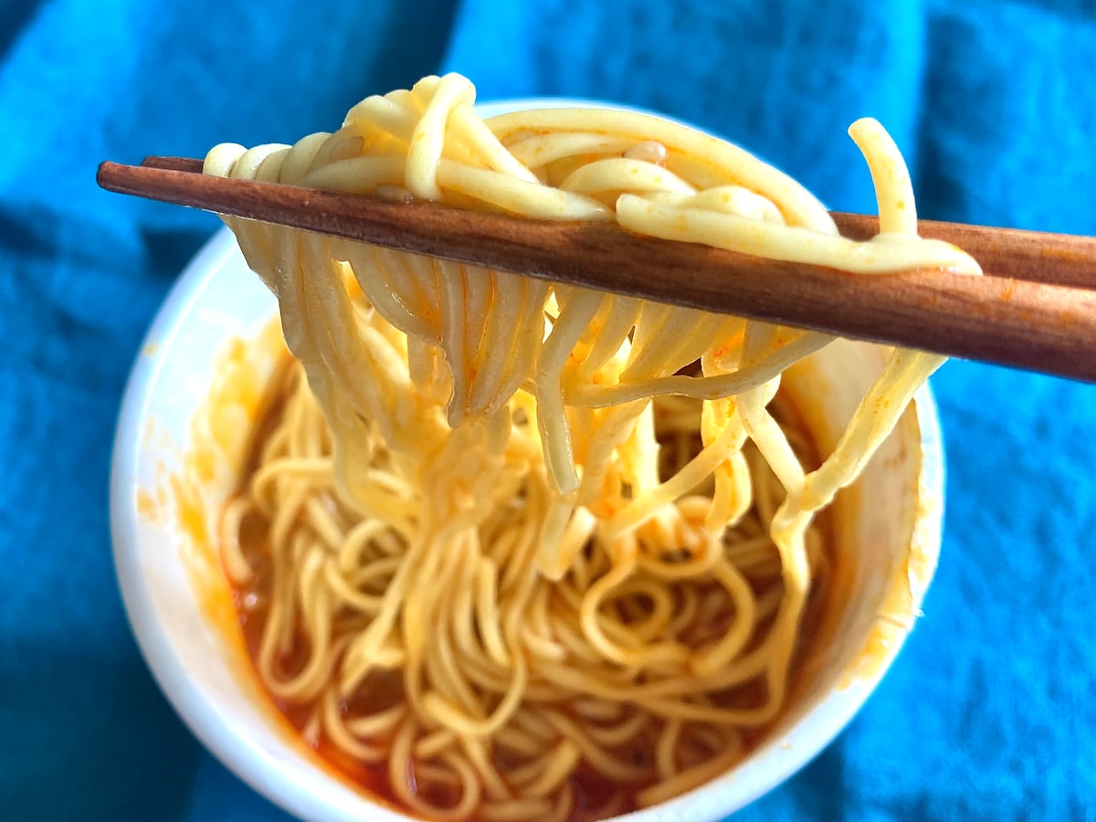 ファミマの社員が厳選するおすすめ辛うま商品として第3位にランクインした「濃厚旨辛担々麺」。練りごまを加えたスープと花椒の香りが食欲をそそるカップ麺で、別添調味油が付いています。