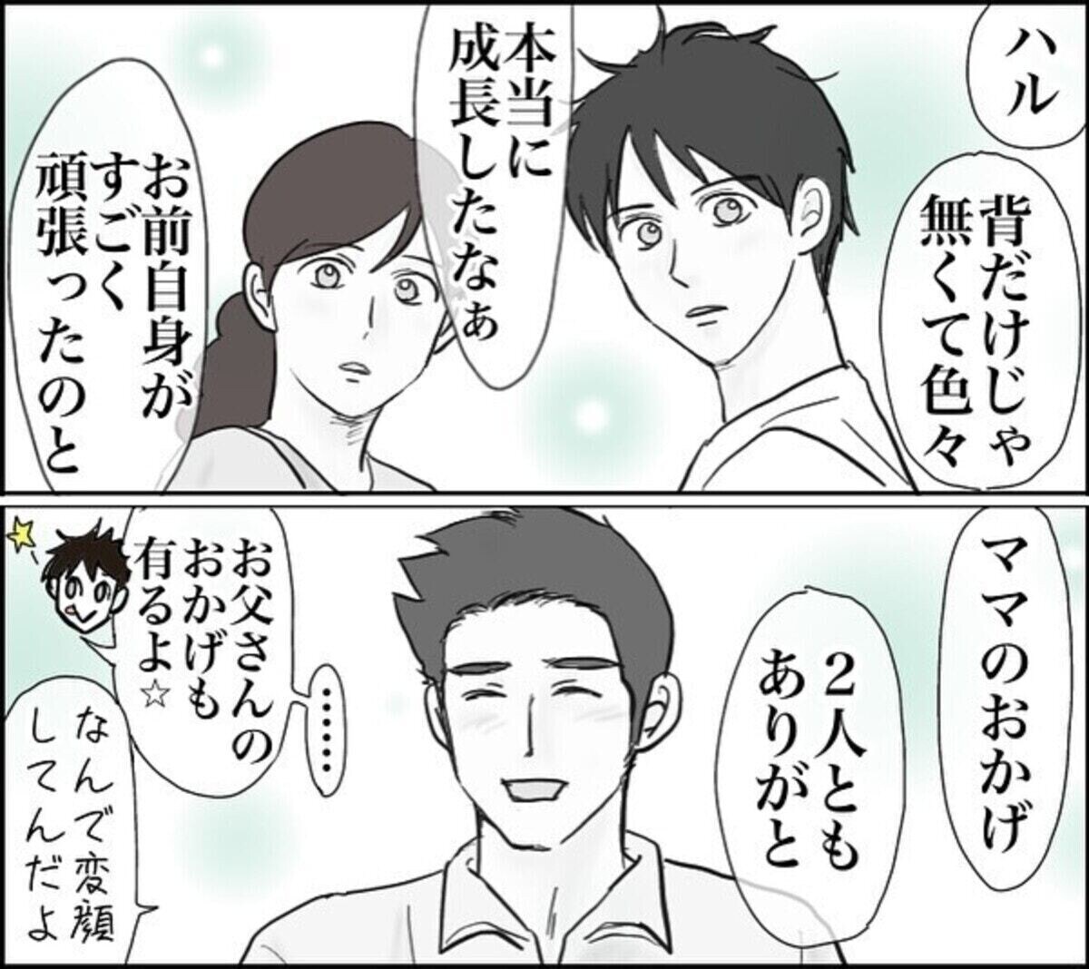 そして自分よりも背が高くなった息子を見てさまざまな面で成長したことを夫は実感し、息子自身の頑張りとふくこさんのおかげだと感謝の気持ちを伝えたのでした。家族の仲がいい様子が会話の節々から伝わってきて見ているこちらまで幸せな気持ちになりますね。