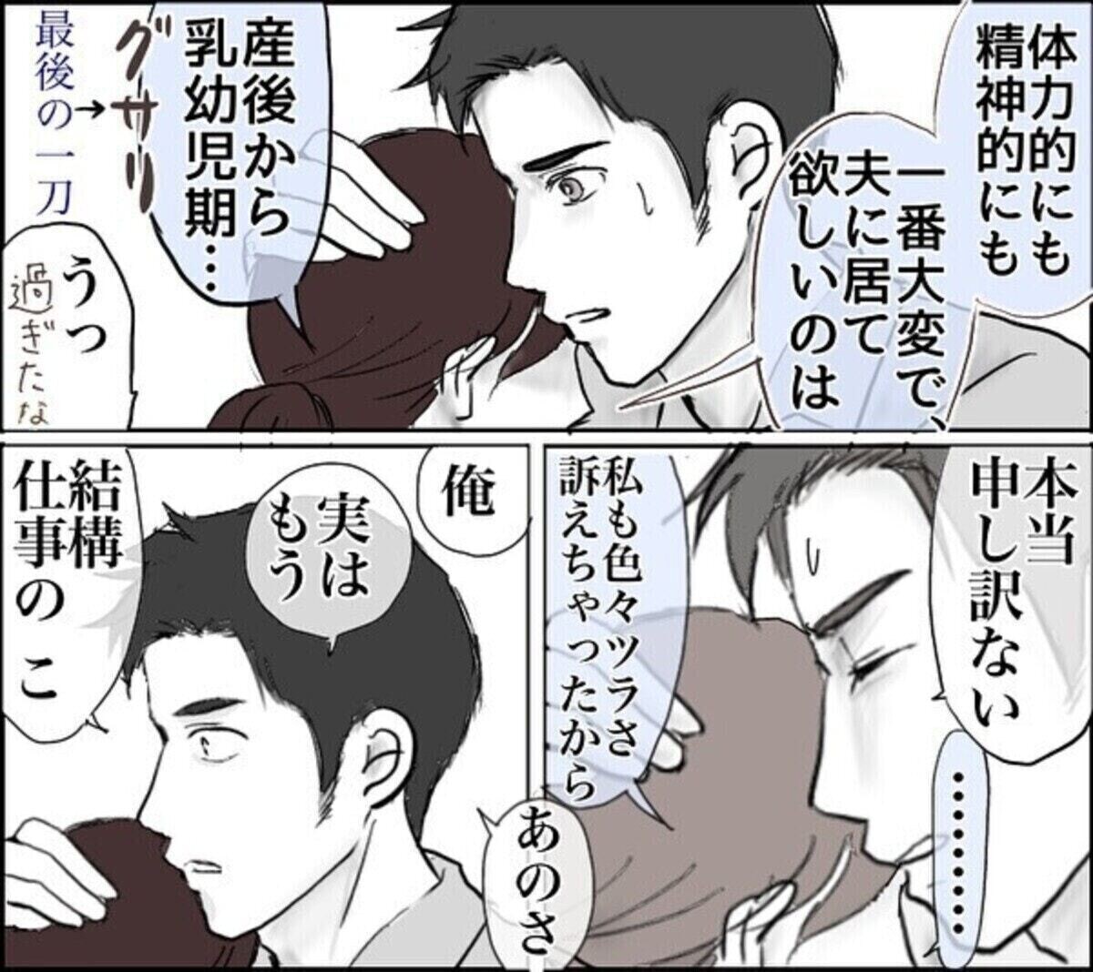 退職したい気持ちを吐露した夫に理解を示し、夫から「子どもたちはこんなに良い母親が居てうらやましい」という趣旨の言葉をかけられたふくこさん。しかし、その瞬間ふくこさんが思い出したのは、過去に夫からかけられた心無いセリフでした。