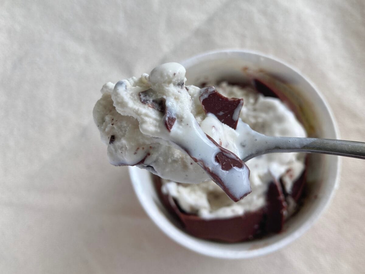 バニラアイスはクリーミーな口どけ。ココアクッキーが入っているので、甘み強めなバニラにどことなくチョコの風味も感じるような、まさしくクッキークリームというお味です。一方、セルフクラッシュのチョコレートは大きめに砕いたこともあってか、ボリボリと固めの食感で面白い! アイスのなめらかさとチョコの存在感が良い対比になっています。