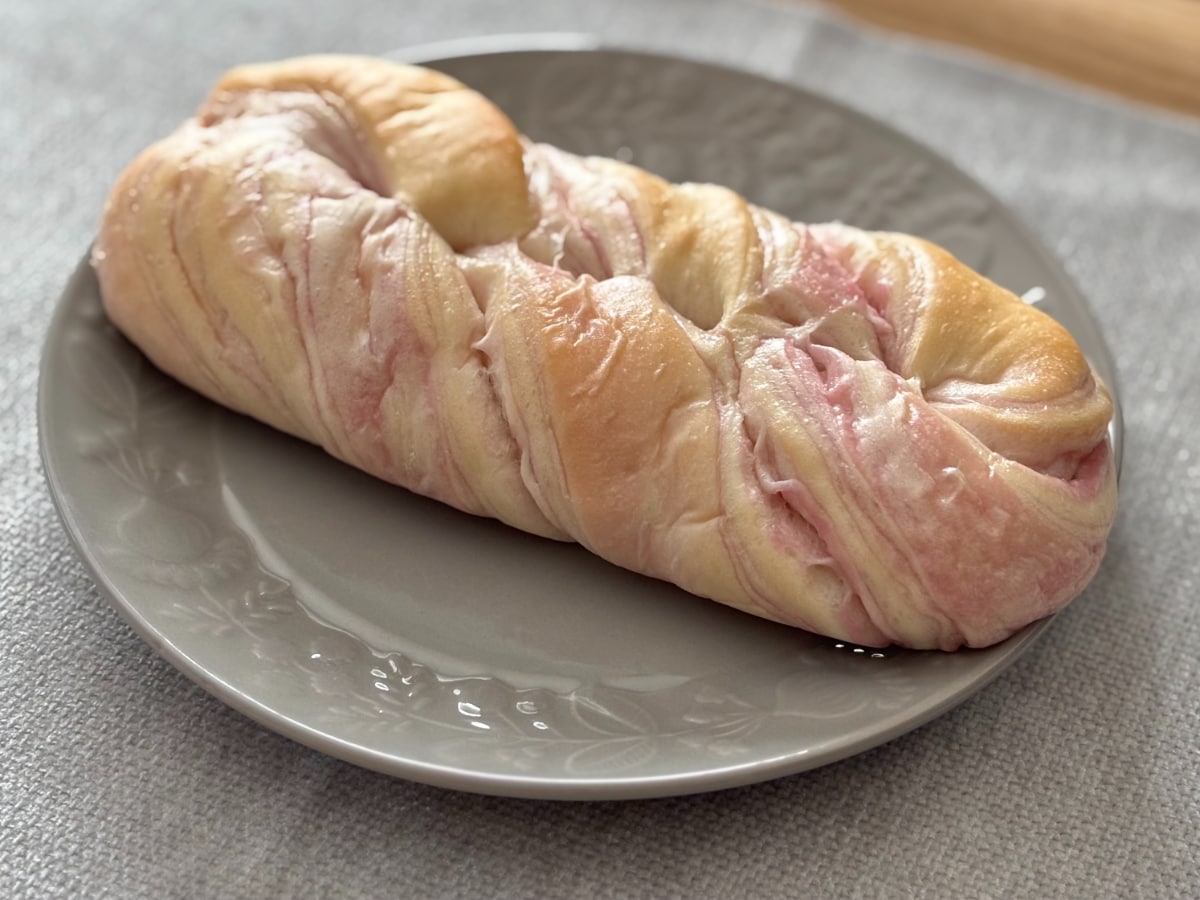 いちご風味が感じられるもちもちとした食感の菓子パン。パン生地をねじり、マーブル模様に仕上げています。