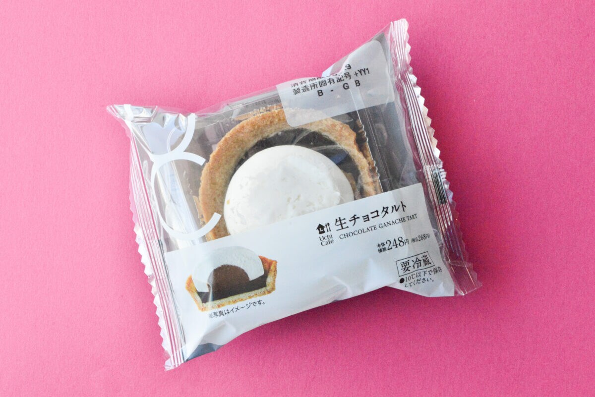 Uchi Cafe’ の「UC」がデザインされたパッケージの「生チョコタルト」は、ローソン標準価格税込268円。デザートコーナーに並べられています。