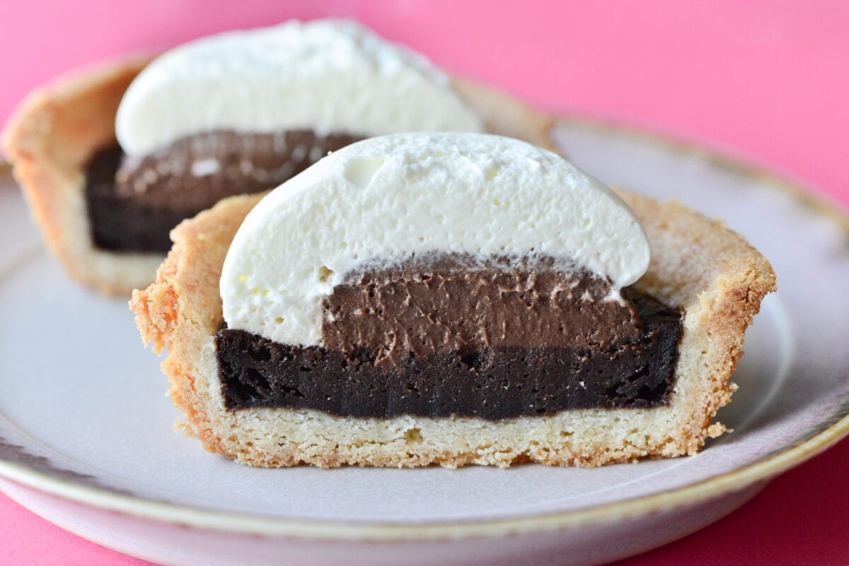 カットしてみると美しい断面があらわれました。2種のチョコレートの味がどのように違うのか気になりますね。
