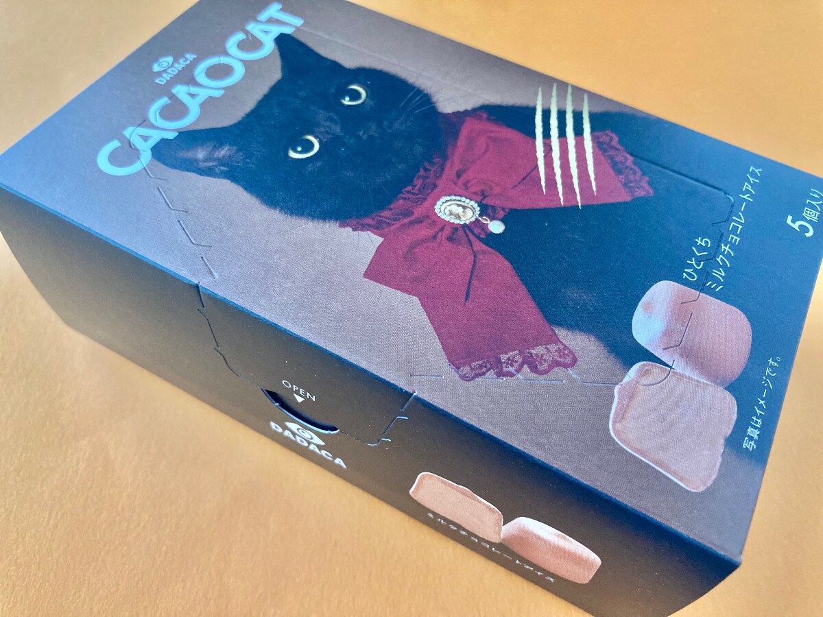 高級感があって可愛らしいパッケージの「CACAOCAT ひとくちミルクチョコレートアイス」。