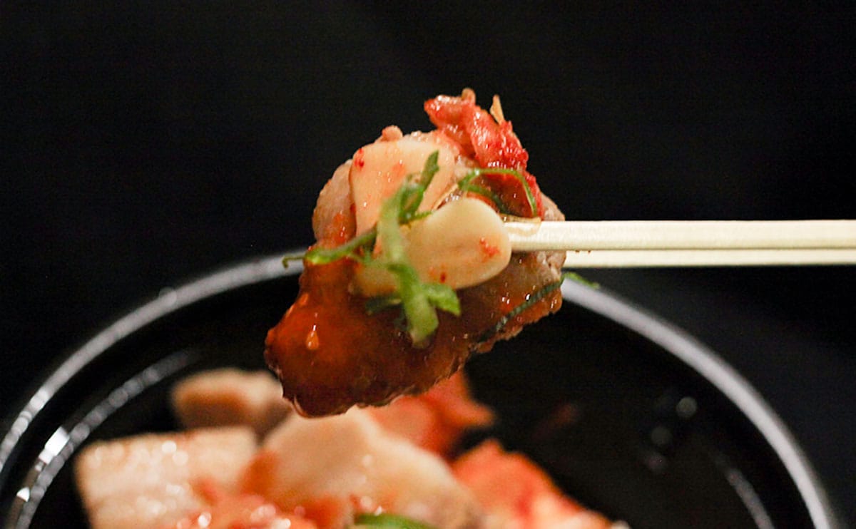 韓国料理のなかでも特に人気の「サムギョプサル」が、定職になって登場。しっかりと焼き上げた極厚豚バラ肉にコチュジャンたれや自社製キムチ、青ねぎ、にんにくスライスをあわせて食べることで、多様な味わいを楽しめるのだとか。
