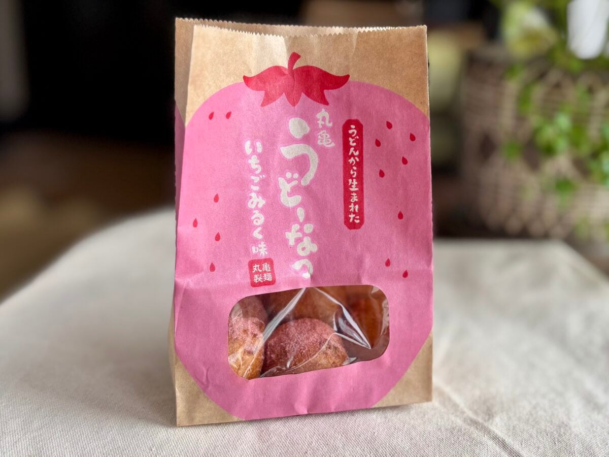 「丸亀うどーなつ」は購入後に自分でパウダーを振りかけて完成させますが、いちごみるく味だけはこれとプラスでディップソースがもらえます。ディップソースは要冷蔵となっていたので、すぐに食べない場合は冷蔵庫などにしまっておきましょう。(とはいえ当日中の食べ切りをおすすめします。)