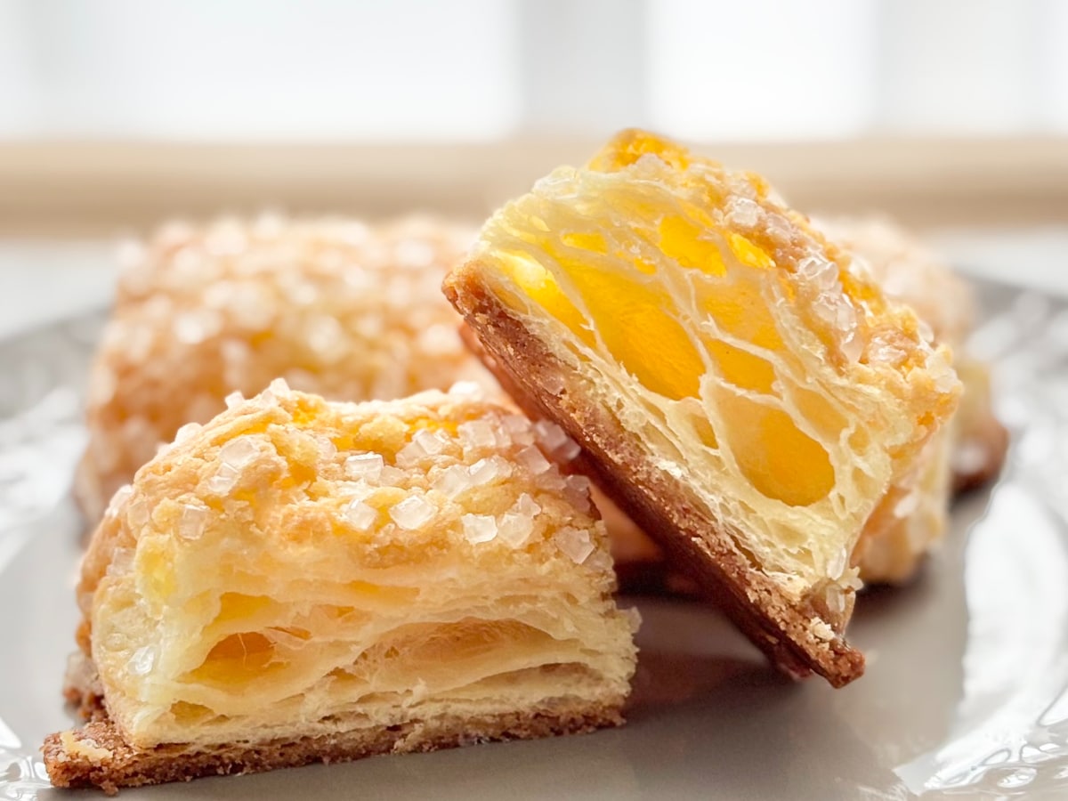 口に入れて最初に感じたのは、ザラメのザクザクッとしたかための食感です。一方、クロワッサン生地はふんわりとした軽めの口当たりで、ザラメとは正反対。2つの食感の対比がたまりません。