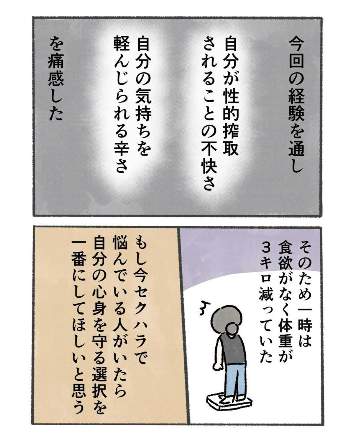 被害者が悪いわけでは決してなく、責められるべきは加害者です。この物語からは、自衛の意識を持つことの重要性を改めて考えさせられます。身体のケアだけでなく、心のケアも大切にして、自分を大事にできるといいですね。