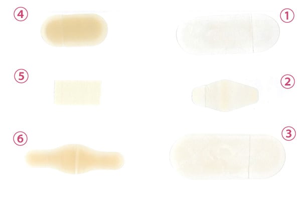 まずは、それぞれのばんそうこうのサイズを比較することに。わかりやすく、一枚の紙に貼ってスキャンしたので、まずは下の画像をご確認を。画像右列上から(1)~(3)、左列上から(4)~(6)のアイテム。