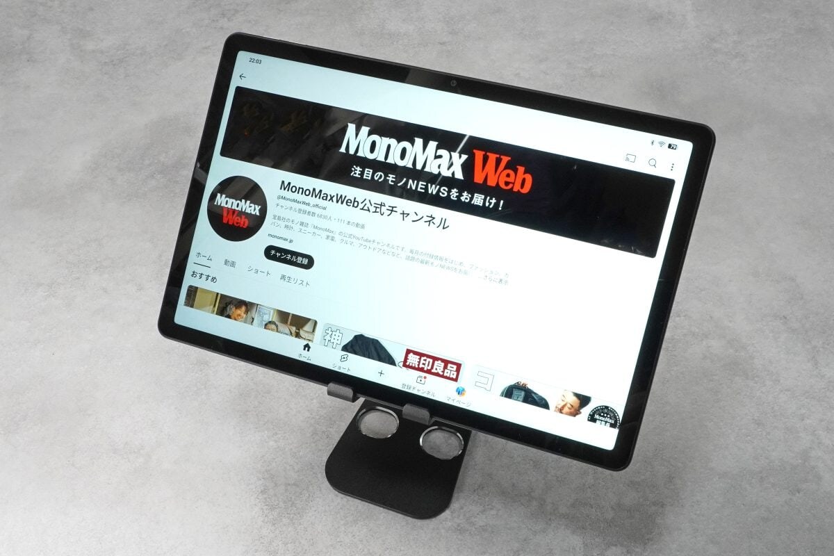 ディスプレイは11インチで、解像度は1,920×1,200。リフレッシュレートは最大90Hzで、精細かつなめらかな映像が観られます。また、低ブルーライトとフリッカーフリーでTÜV Rheinland認証を取得しています。「おやすみモード」が環境に合わせて自動で明るさを調整するので、昼夜問わず目に優しいのも嬉しいポイント。(タブレットスタンドは私物。以下同)