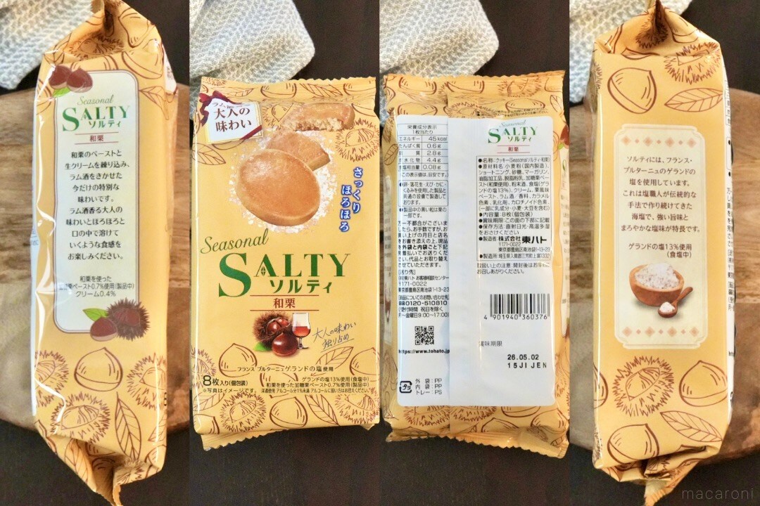 和栗を使用した加糖栗ペーストを混ぜ込んだ、期間限定の「ソルティ」。ソルティは、フランス・ブルターニュのゲランドの塩を使用したまろやかな塩気が特長の口溶けの良いクッキーです。