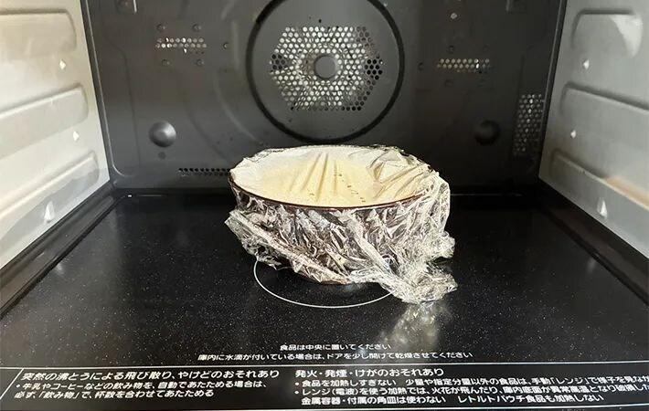 ダシを耐熱容器に移し、600wに設定した電子レンジで1分半~2分加熱します。卵が固まっていない時は、再度様子を見ながら加熱してくださいね。