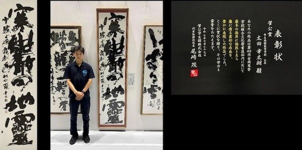 太田幸太朗氏「地元函館の、立待岬の巖に降る雪の情景をイメージして書きました。総文祭では仲間達と作品制作の過程などを交流でき、書道を心の底から愉しいと感じることができました。これからも書道を続ける中で、先生や仲間との縁を大切にしていき、後輩の手本となれるよう精進していきたいと思います」(一部抜粋)