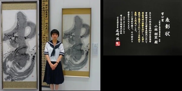 渡邉葉留奈氏「工業高校でテキスタイルを学んでいる私が、地元岡山の企業から素晴らしい賞をいただき大変光栄に思っています。百人一首から好きな歌を選び、美しい料紙に仮名の持つ雅な世界を表現しました。専門科での学びを書に生かした今回の作品が評価いただけたことはこれからの高校生活の糧になると確信しています。今後も流麗な仮名の美を追求していきたいと思います」(一部抜粋)
