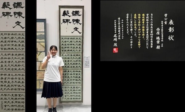 西原瑞葉氏「私は作品を制作する中で多くの情熱を注ぎました。楊峴を臨書するにあたり楊峴の良さを潰さないよう意識しました。楊峴の魅力は『完璧でない美しさ』だと私は考えます。その魅力をどのようにして表現するか、筆使いはもちろん構成や表装など細かい部分までこだわりました。この作品制作は自身に大きな成長を与えてくれました。この経験を胸にさらなる成長が出来ればと思っています」(一部抜粋)