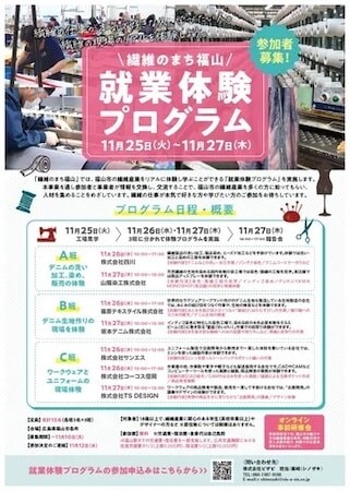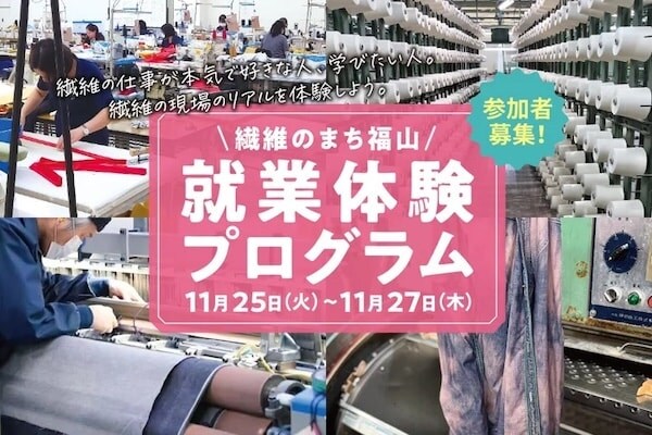 福山市では、地場産業である繊維産業をリアルに体験・学習できる「繊維のまち福山 就業体験プログラム」を11月25日(火)〜27日(木)に実施する。11月10日(月)まで、参加者を募集している。