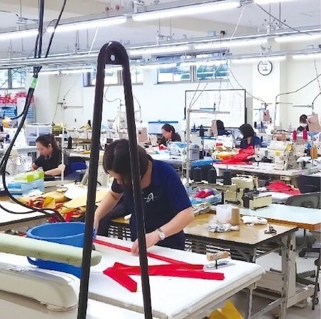 C班は、ワークウェアとユニフォームの現場体験を実施。26日に、ユニフォーム製造で企画開発から販売まで一貫した体制を敷いているサンエスを訪れる。同社では、ミシンを使ったトートバッグのポケット縫いの縫製作業を体験する。また同日、作業服や作業靴・軍手・帽子などを製造販売するコーコス信岡も訪問。CADやCAMなどコンピュータツールを使った裁断と縫製、商品検査の業務体験を行う。そして27日、ワークウェアの商品開発や製造、販売を一貫して手掛けるTS DESIGNへ。企画開発の講義やデザインの体験をする。