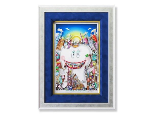 「スマイル・デンティスト」は、同氏の歯医者さんシリーズの新作だ。大きな歯の上に昇る太陽がとても印象的で、紺色の空が明るくも儚いような雰囲気を演出する一作。イメージサイズは約53cmx33cm、フレームサイズは約80cmx58cm、制作年は2025年だ。