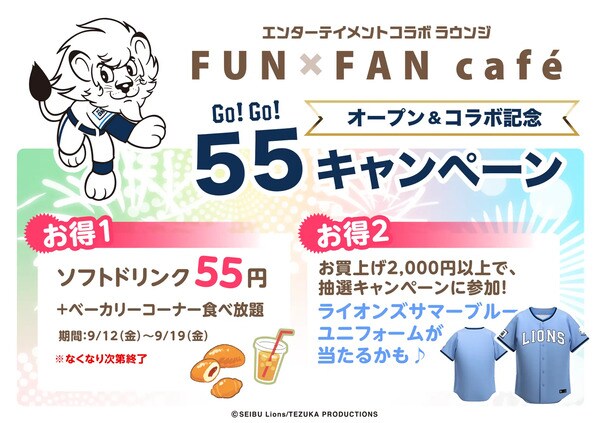FUN×FAN café オープン&埼玉西武ライオンズコラボ記念「GO! GO! キャンペーン」では、9月12日(金)~12月末(予定)の期間、店内にて、ライオンズグッズやライオンズストアオンラインで展開している「おうちでライオンズグルメ」を販売。