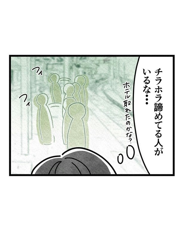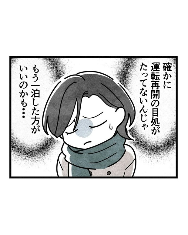 新幹線に乗車するのを諦めてその場を立ち去る人たちがチラホラ…。運転再開の目途がたっていないのであれば、もう1泊したほうがいいのでは?とさほさんの頭をよぎります。