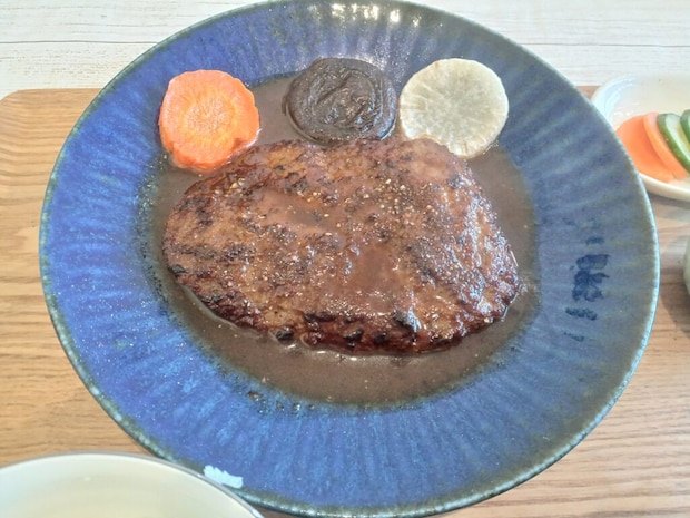 ハンバーグは結構大きいです!デミグラスソースがかかっていて、付け合わせは大根、人参、椎茸です。大根と椎茸は珍しいですね。和のテイストを感じます。
