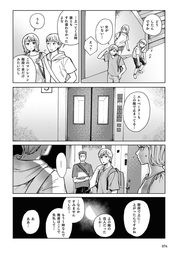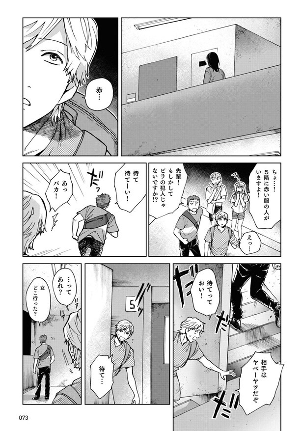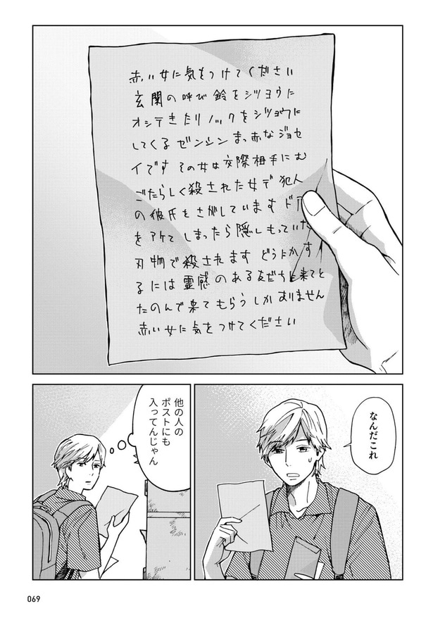 「赤い女に気をつけて」マンションの集合ポストに入っていた変なチラシ。そのことを聞いたバイト先の後輩たちが家に着いてくることになった。マンションに近づき、自室のある5階を見上げると、そこにいたのは…?