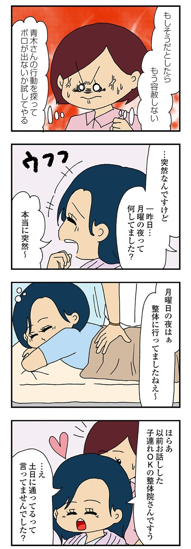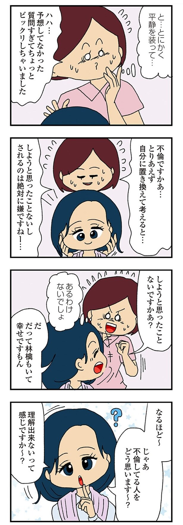 前回、不倫相手として疑っている橙山さんと青木さんがなつめのサロンへ来ることになった。まず来店してきたのは青木さん。すると、青木さんから突然「不倫ってどう思います?」と質問されて…?