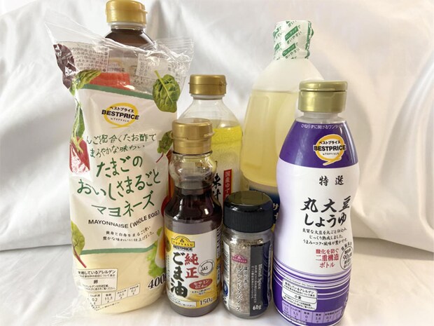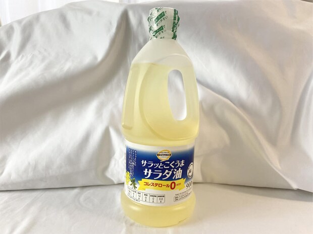 「トップバリュベストプライス サラッとこくうまサラダ油 900g」(税込278.64円)は、サラッとしたキャノーラ油をベースにコクとうまみの大豆油をブレンド。うれしいコレステロール0。サラダ油は、300円~600円という価格設定が多い中、300円以下で購入できるのはトップバリュだからこそ。