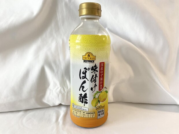 「味付けぽん酢」(税込 213.84円)は、国産ゆず果汁の風味をいかしつつまろやかな味わいの味付けぽん酢。「安いのに味が美味しい!」 と、トップバリュの商品の中でも人気の調味料。