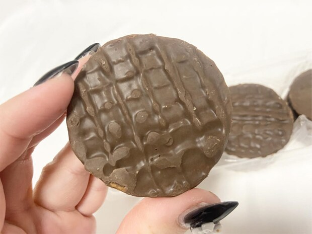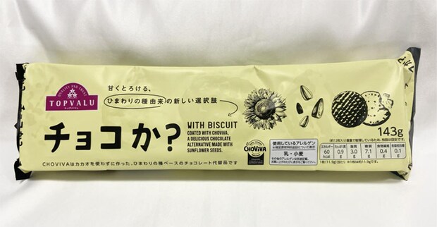 SNSでも話題になっている「トップバリュ チョコか? WITH BISCUIT 143g」(税込429.84円)は、カカオを使わずに作ったチョコレート代替品をかけたビスケット。